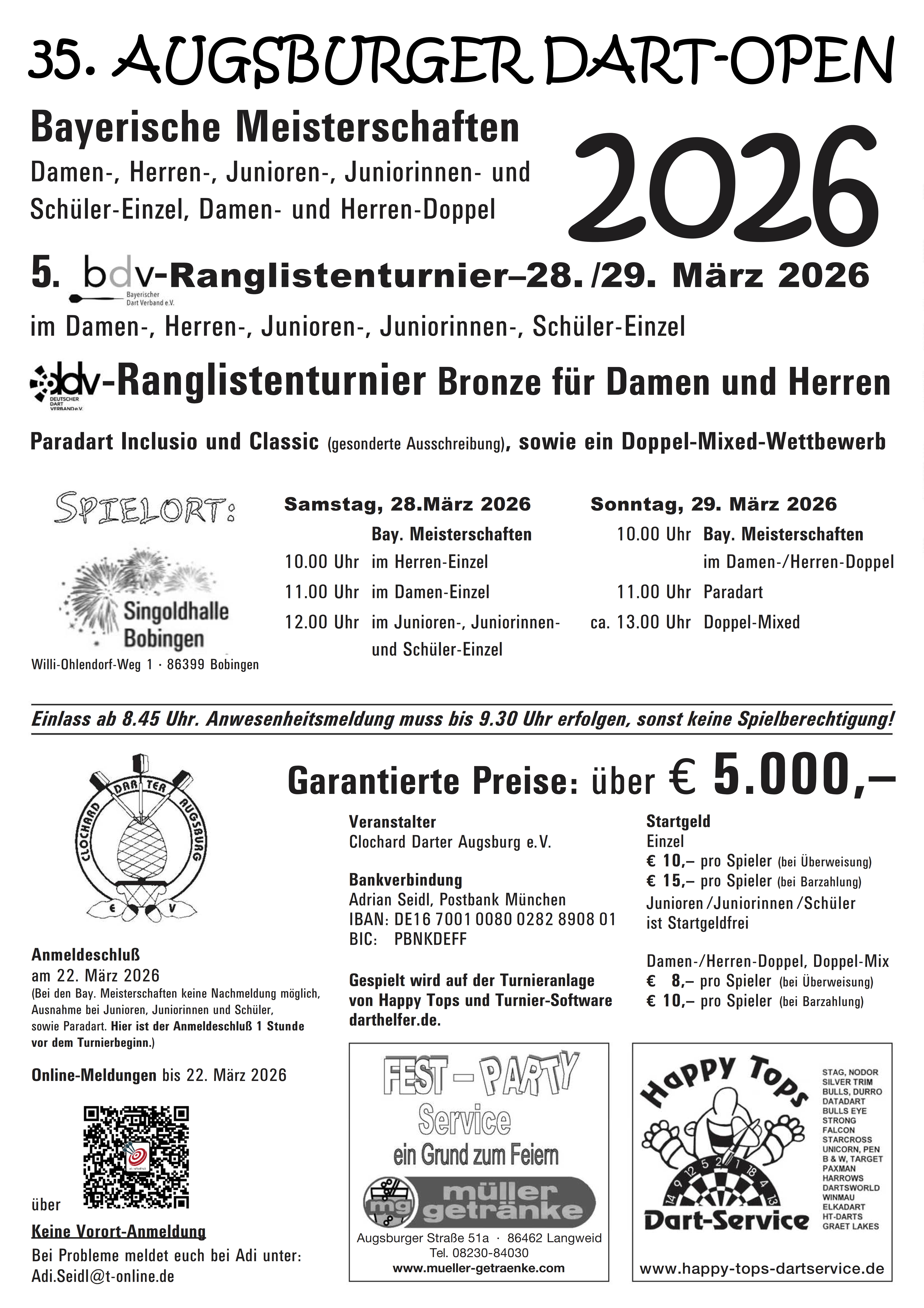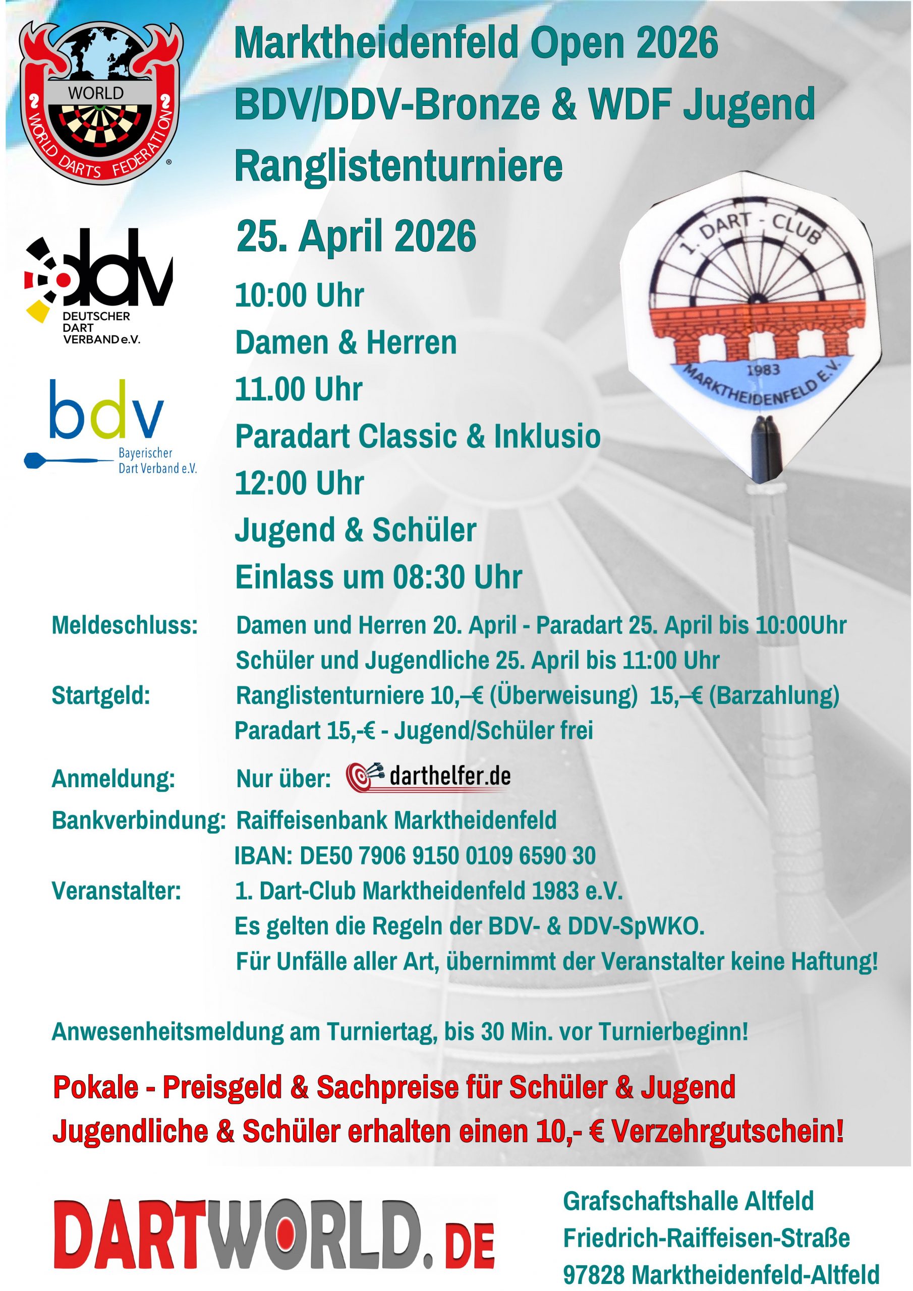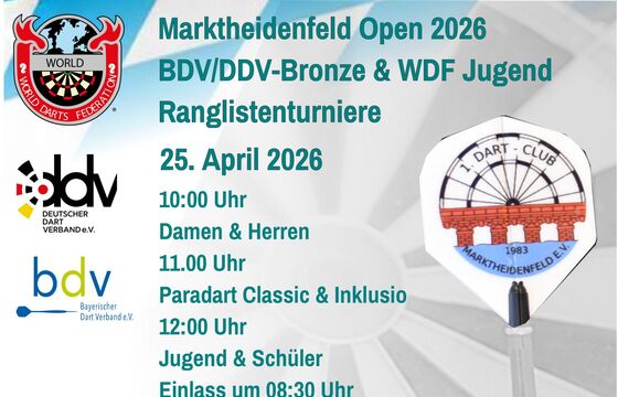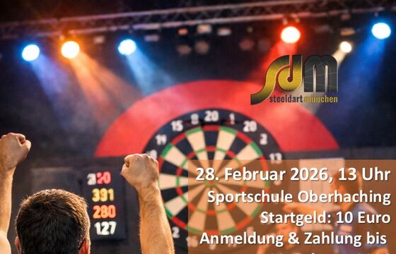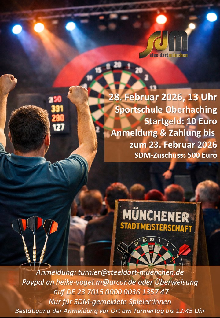 Die diesjährige Stadtmeisterschaft findet am Samstag, den 28. Februar 2026, ab 13 Uhr in der Sportschule Oberhaching statt. Anmeldungen bitte vorab, bis zum 23. Februar 2026 an turnier@steeldart-muenchen.de. Die Anmeldung ist nur gültig, wenn auch das Startgeld von 10 Euro gezahlt wird. Zahlung per Paypal an heike-vogel.m@arcor.de oder Überweisung auf DE 23 7015 0000 0036 1357 47. Etwaige Abmeldungen (und Erstattungen) können ebenfalls nur bis zum 23. Februar 2026 berücksichtigt werden, da im Anschluss die Turnierplanung erfolgt. Am Turniertag bitten wir um Bestätigung der Anmeldung vor Ort bis 12:45 Uhr. Alle Informationen findet ihr noch einmal beigefügt im Flyer. Die Sportschule hat uns Ruhe im Forumsbereich zugesagt, so dass wir uns auf ein hoffentlich entspanntes Turnier freuen können. Zudem stocken wir den Preisgeld-Topf wie üblich ordentlich auf. |